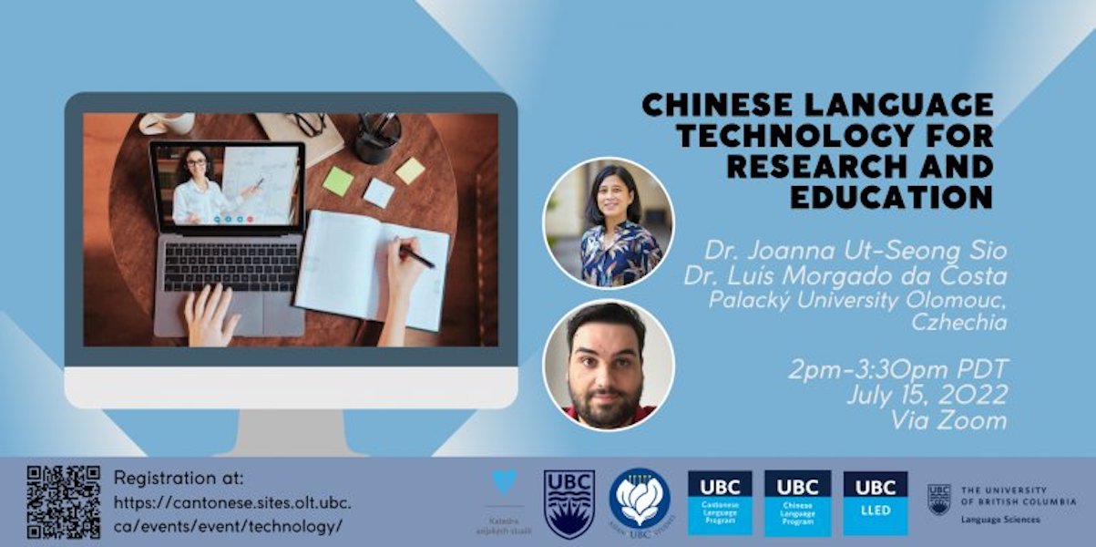 On Friday on July 15th, hosted by the Cantonese Language Program with the Department of Asian Studies, Dr. Joanna Sio and Dr. Luis Morgado from the Asian Studies Department of Palacký University Olomouc at the Czech Republic will be visiting UBC and presenting on "Language Technology for Research and Education“.