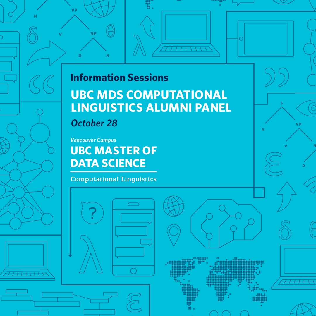 Join the UBC Master of Data Science (MDS) program as we will be hosting a series of virtual information events in October. Attendees will learn more about the student experience in the MDS program in Vancouver and the Okanagan as well as the Computational Linguistics program.