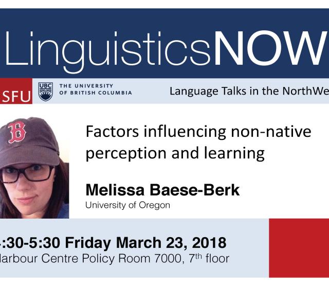 Melissa Baese-Berk from the University of Oregon will be giving a talk (Factors influencing non-native perception and learning) as part of the series Language Talks in the NorthWest. Sponsored by Simon Fraser University and University of British Columbia Departments of Linguistics.